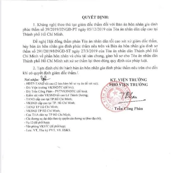 Ngày 3-4, tin từ VKSND Tối cao cho biết đã có quyết định kháng nghị giám đốc thẩm đối với bản án hôn nhân gia đình phúc thẩm số 39/2019 ngày 5-12-2019 của TAND Cấp cao tại TP.HCM.