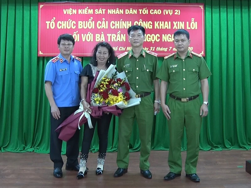 Ngày 31-7, tại trụ sở UBND phường Đa Kao (quận 1, TP.HCM), VKSND Tối cao đã tổ chức buổi xin lỗi công khai đối với luật gia Trần Thị Ngọc Nga (sinh năm 1954, nguyên Giám đốc Công ty Vinh Luật). Bà Nga từng bị khởi tố, truy tố oan về tội lừa đảo chiếm đoạt tài sản từ năm 2009.