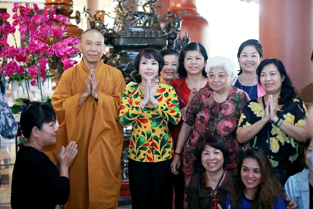 Từ sáng sớm, xe được chuẩn bị sẵn sàng để đón 400 Phật tử, đồ ăn sáng, nước uống cũng được trao tận tay mọi người. Có mặt từ sớm trong chiếc bà ba giản dị, Việt Hương khuấy động không khí với nụ cười rạng rỡ và những lời hỏi thăm chân tình.