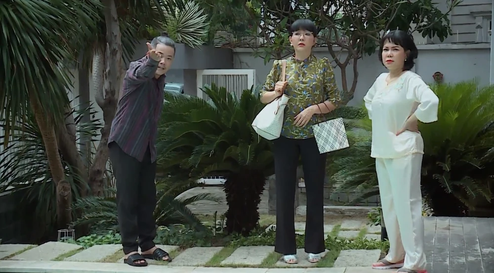 Việt Hương đang quét nhà nhìn ra thì thấy Phương Dung đang từ cửa đi vào, theo sau là Hoàng Mèo đang cầm điện thoại quay video.