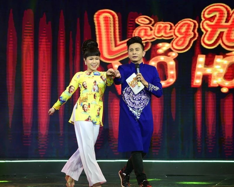 Việt Hương và MC Đình Toàn ở "Làng Hài mở hội" mùa 1.
