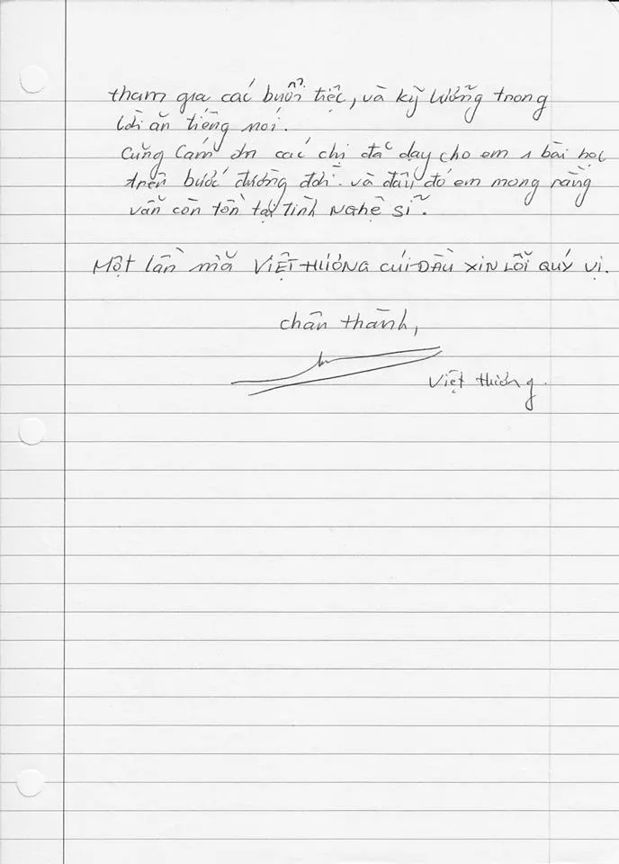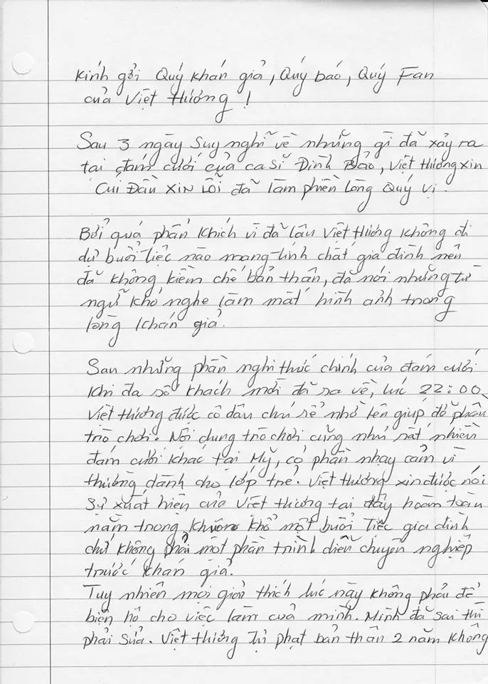 Bức thư tay được Việt Hương công bố một giờ cách đây trên Facebook của mình. Việt Hương viết: “Thư XIN LỖI xin viết tay với sự trân trọng của Việt Hương”. Trong bức thư Việt Hương nói rằng sau ba ngày suy nghĩ chị xin cúi đầu nhận lỗi. Chị nói do rất lâu rồi không tham gia một buổi tiệc mang tính chất gia đình nên phấn khích nói những từ ngữ khó nghe làm mất hình ảnh trong lòng khán giả.