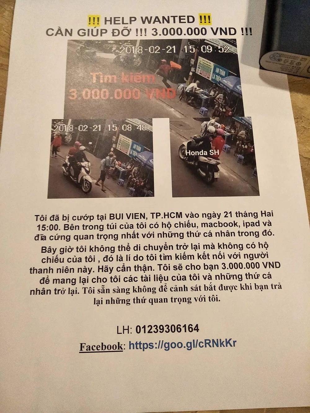 Theo đó, nạn nhân là anh Huỳnh Hoàng Dương (26 tuổi, Việt kiều Đức), tài sản bị mất là túi xách có tiền, giấy tờ tùy thân và một ổ cứng chứa các dữ liệu cá nhân, được cho là rất quan trọng.