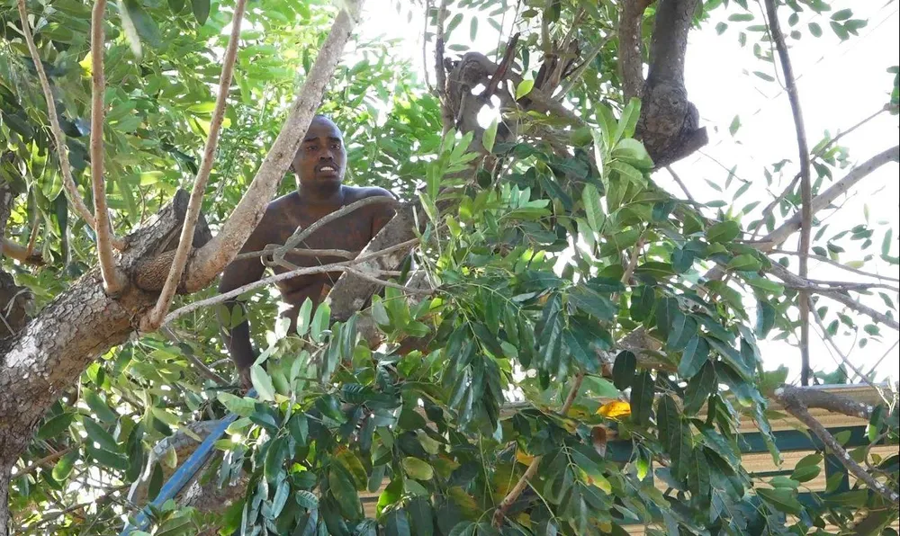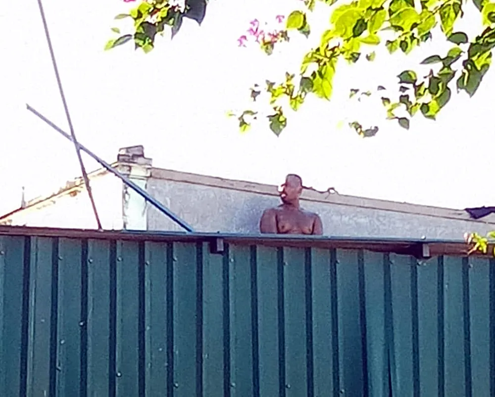 Người này đứng trên mái nhà la hét, đập phá mái nhà và cầm đá huơ loạn xạ.