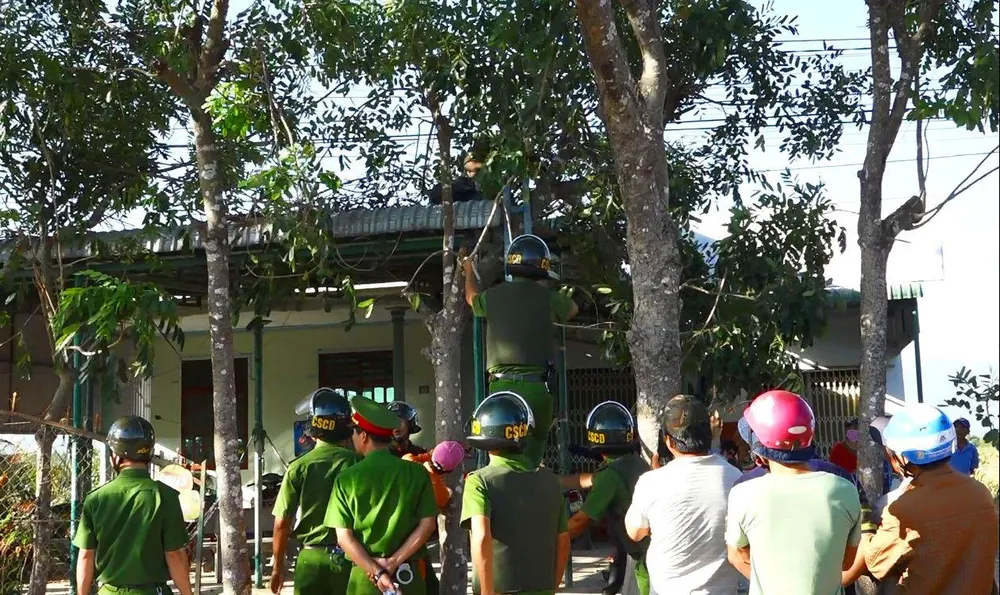 Trước đó, khoảng 11 giờ trưa 9-1, người dân phát hiện một người đàn ông to lớn ở trần, xăm trổ đầy mình leo lên mái nhà dân ở thôn Ba Bàu, xã Hàm Thạnh, huyện Hàm Thuận Nam.