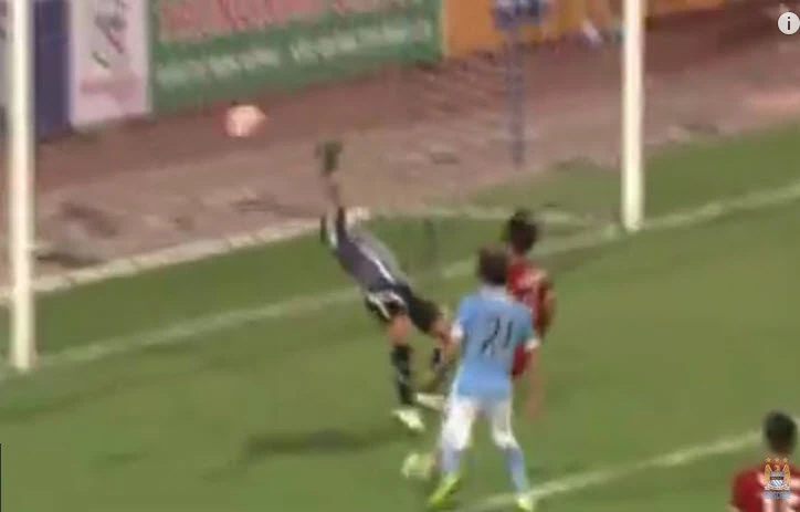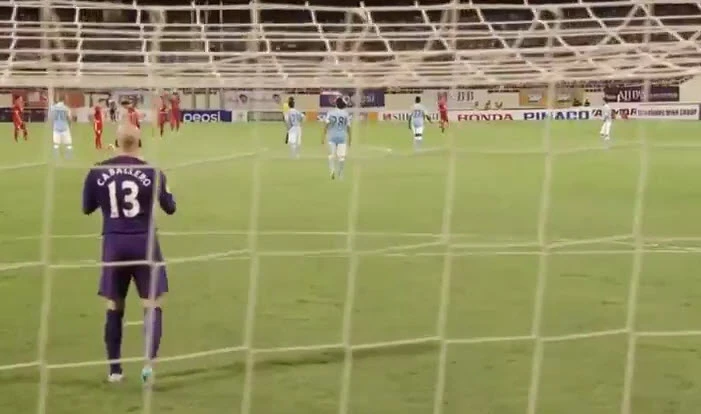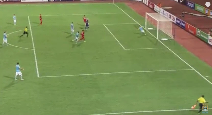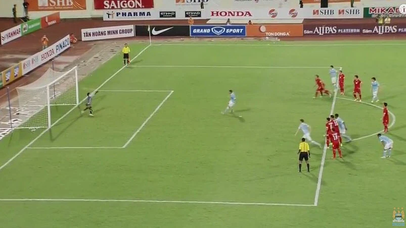 Vàoooooooooo. Phút 11, Kalarov có pha đá phạt trực tiếp tuyệt đẹp khiến thủ môn Vĩnh Lợi chỉ biết đứng nhìn bóng bay vào lưới. 1-0 cho Man City.
