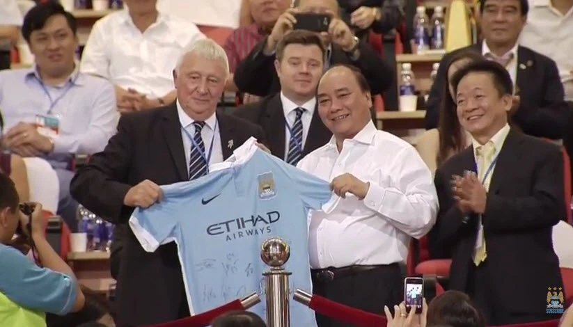 Phó thủ tướng Nguyễn Xuân Phúc nhận chiếc áo có chữ ký của các cầu thủ Man City từ đại sứ Anh tại Việt Nam.