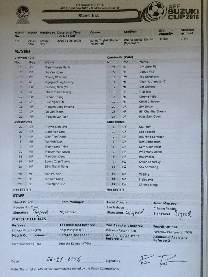 Cầu thủ xuất sắc nhất của họ là tiền đạo Vathanaka liên tục làm khổ hàng phòng ngự của đội tuyển Việt Nam. Những phút cuối hiệp 1, Campuchia suýt có bàn thắng san bằng tỉ số từ 2 tình huống đá phạt góc nhưng Nguyên Mạnh cũng với sự tỉnh táo của hàng thủ đã hóa giải tất cả.