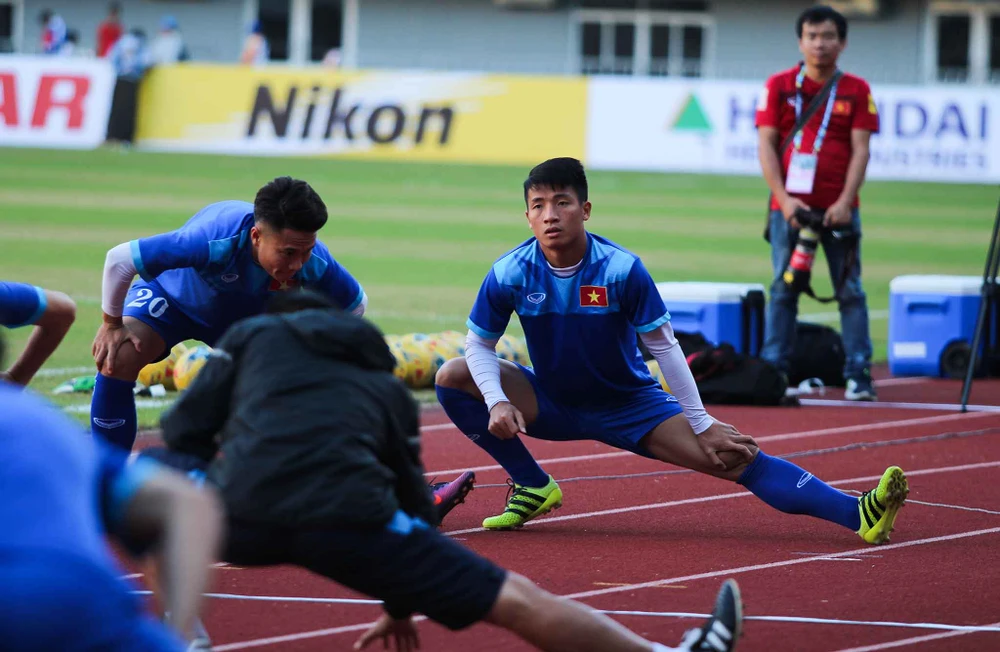 Các tuyển thủ Việt Nam khởi động trên sân. Ảnh: HUY PHẠM