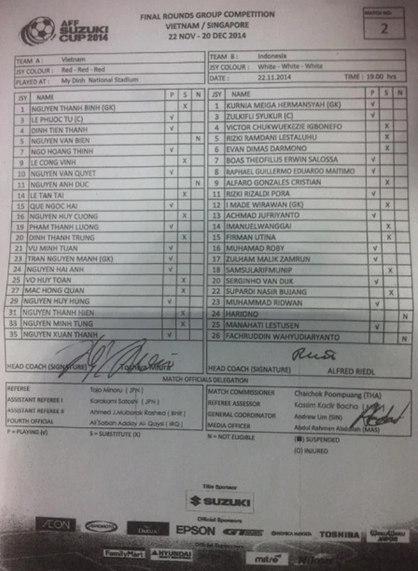 Ở trận đấu này, tiền đạo Hải Anh được HLV Miura tin tưởng cho ra sân ngay từ đầu. Điều này đồng nghĩa với Công Vinh phải ngồi ghế dự bị khi mà Văn Quyết với phong độ xuất sắc của mình nghiễm nhiên chiếm một suất đá chính trên hàng tiền đạo. Bên cạnh đó, cả Tấn Tài cũng phải ngồi dự bị. Do đó, chiếc băng đội trưởng của đội tuyển Việt Nam trong trận đấu với Indonesia đã thuộc về Lê Phước Tứ.