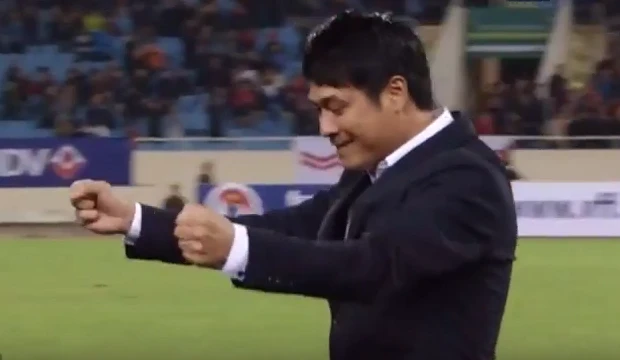 HLV Hữu Thắng phấn khích với bàn thắng san bằng tỉ số của Công Vinh.