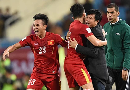HLV Hữu Thắng và các cầu thủ Việt Nam vui mừng với một hiệp đấu rất thành công. Ảnh: QUANG THẮNG