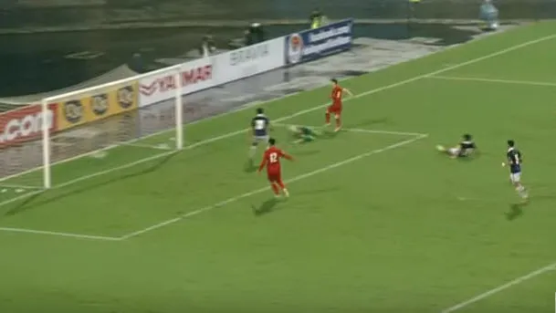 Vàooooooooo. Phút 13, từ pha tấn công nhanh, Thanh Trung có cú sút ngoài vòng cấm, bóng đập người hậu vệ Campuchia đổi hướng đi luôn vào lưới. 1-0 cho Việt Nam.
