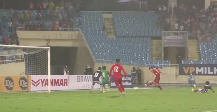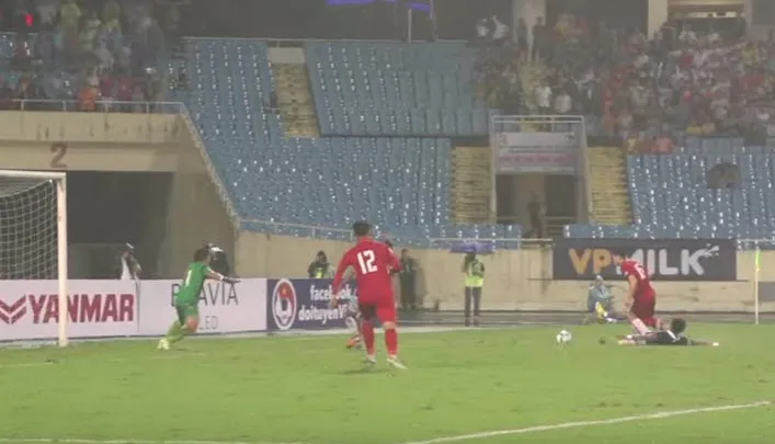 Phút 87, từ quả đá phạt trực tiếp, Chanthacheary sút bóng vòng qua hàng rào, Tuấn Mạnh bay hết cỡ nhưng không thể chạm tay vào bóng nhưng bóng lại đi trúng cột dọc bật ra.
