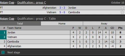 Ở trận đấu giữa Afghanistan và Jordan kết thúc cách đây ít phút, hai đội đã hòa nhau với tỉ số 3-3. Với kết quả này, chỉ cần thắng Campuchia là Việt Nam sẽ đứng trước cơ hội lớn giành vé dự VCK Asian cup 2019.