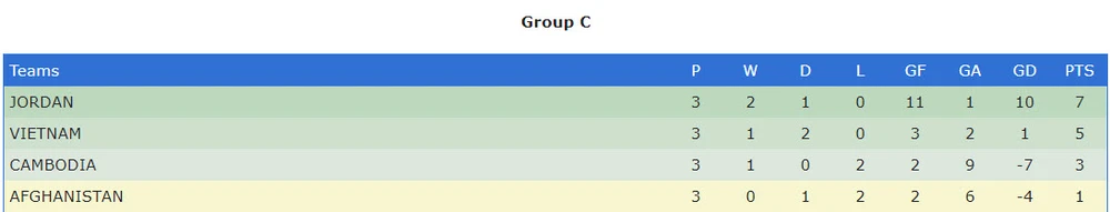 Bảng xếp hạng bảng C vòng loại Asian Cup 2019: