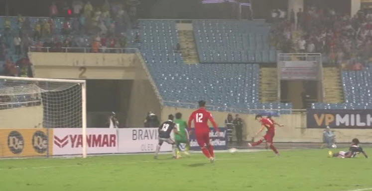 Phút 44, Văn Hậu có pha sút xa ngoài vòng cấm đưa bóng đi chệch cột trong gang tấc.
