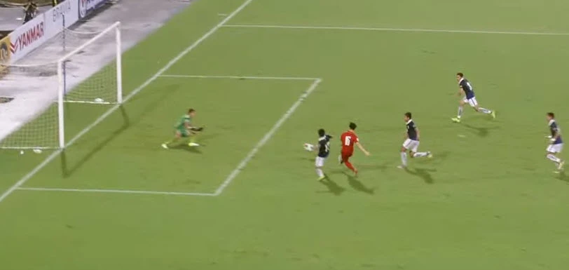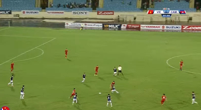 Từ đầu trận đến giờ, các cầu thủ Campuchia chủ yếu tấn công vào phải của Âu Văn Hoàn.