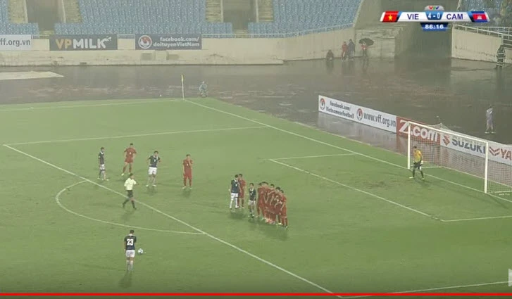 Hơn năm phút đầu tiên của trận đấu đã trôi qua, các cầu thủ Campuchia đang thi đấu rất sòng phẳng trước Việt Nam. Trời mưa lớn trước trận đấu khiến mặt sân Mỹ Đình trở nên trơn trượt vì nước mưa.