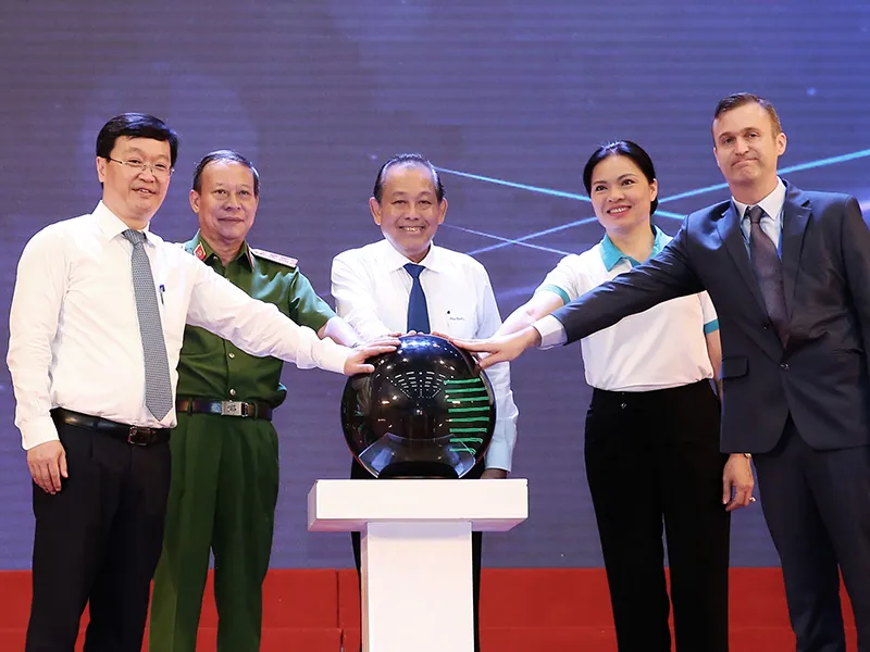 Phó Thủ tướng thường trực Trương Hòa Bình và các đại biểu ấn nút thể hiện cam kết nỗ lực phòng, chống mua bán người. Ảnh: VGP
