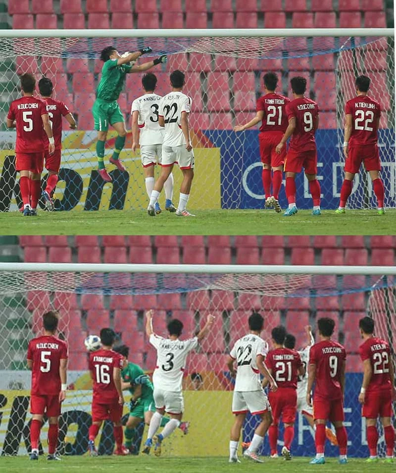 Rất tiếc là niềm vui của thầy trò ông Park không kéo dài lâu. Chỉ hơn 10 phút sau đó, thủ môn Bùi Tiến Dũng tái diễn sai sót như ở SEA Games 30. Lần này là cú sút phạt ngoài 30 m của Kang Kuk-chol. Bùi Tiến Dũng cẩn trọng đấm bóng chứ không bắt nhưng cú đấm nắn nót đấy lại không đi vào tâm bóng mà trượt xuống mép dưới. Quả bóng bướng bỉnh như trêu ngươi thầy trò ông Park khi tìm đúng xà rồi bật vào người Tiến Dũng đi qua vạch cầu môn.