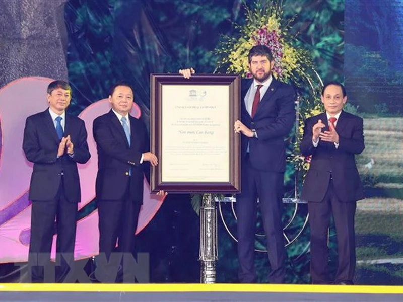 Ông Michael Croft, Trưởng đại diện Văn phòng UNESCO tại Việt Nam, trao danh hiệu Công viên địa chất toàn cầu UNESCO Non nước Cao Bằng. Ảnh: THỐNG NHẤT/TTXVN