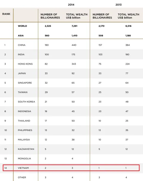 Báo cáo “Billionaire Census 2014” của Wealth-X và UBS (ngân hàng Thụy Sĩ) cho biết, Việt Nam có 2 tỷ phú với tổng tài sản khoảng 3 tỷ USD. Trong báo cáo này năm ngoái, Việt Nam chỉ có một đại diện duy nhất với quy mô tài sản 1 tỷ USD.