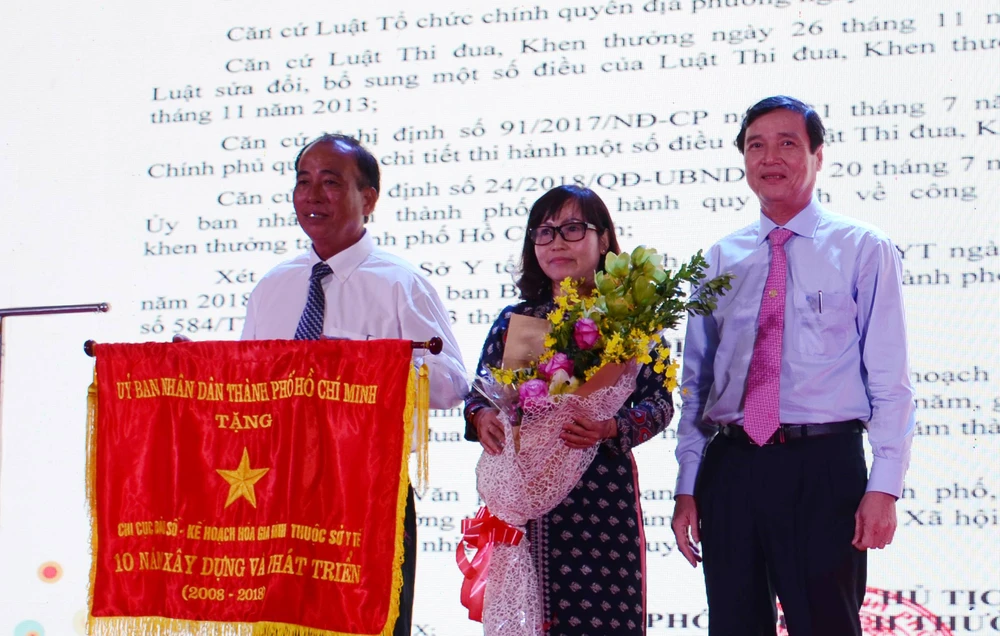 Tại buổi lễ, Chi cục DS-KHHGĐ TP đã vinh dự đón nhận cờ truyền thống của UBND TP. Ảnh: HL