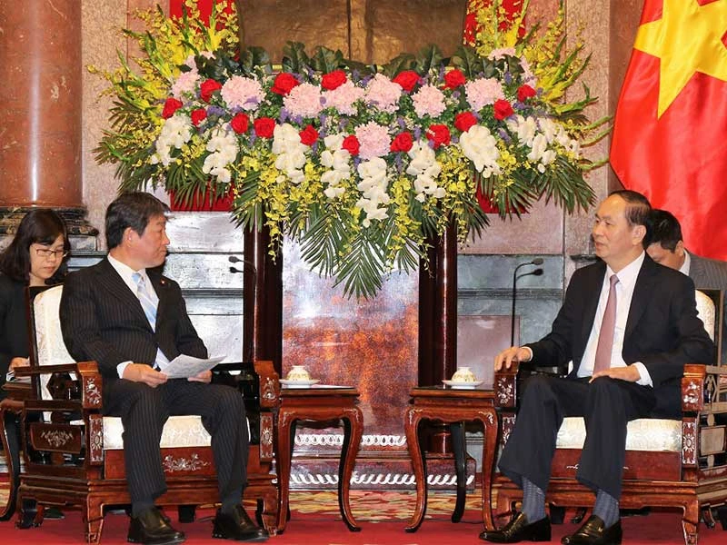 Chủ tịch nước Trần Đại Quang tiếp Bộ trưởng Tái thiết kinh tế Nhật Bản Toshimitsu Motegi. Ảnh: VPCTN