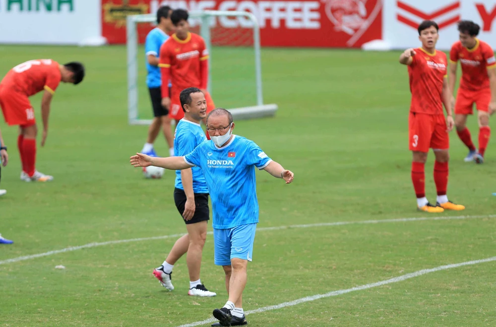 HLV Park Hang-seo đôn đốc các tuyển thủ Việt Nam tập luyện cho vòng loại 3 World Cup 2022. ẢNH: VFF
