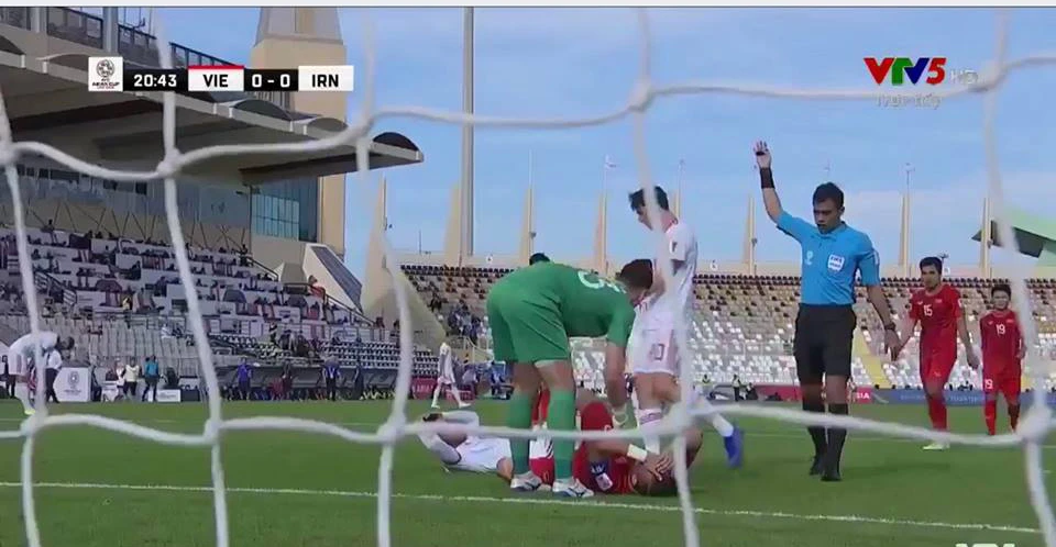 Phút 22, Ngọc Hải và cầu thủ Iran nằm sân sau pha tranh chấp ngay trước vòng cấm địa Việt Nam.
