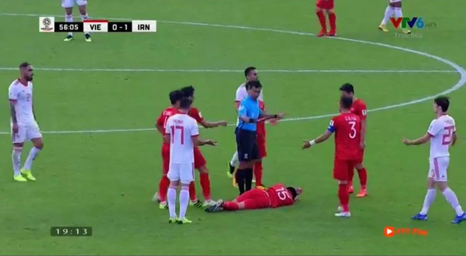 Phút 74, cầu thủ Việt Nam ra hiệu bóng đã chạm tay cầu thủ Iran trong vòng cấm nhưng trọng tài vẫn cho trận đấu tiếp tục.