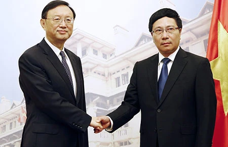Phó Thủ tướng, Bộ trưởng Ngoại giao Việt Nam Phạm Bình Minh (phải) hội đàm với ông Dương Khiết Trì. Ảnh: Reuters