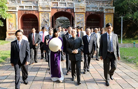 Chiều 19-10, tại Thừa Thiên-Huế, Quốc vương Campuchia Norodom Sihamoni đến thăm Đại nội. Ảnh: TTXVN