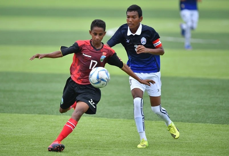 Philippines (áo xanh) đã bị U-15 Việt Nam dội "mưa gôn".