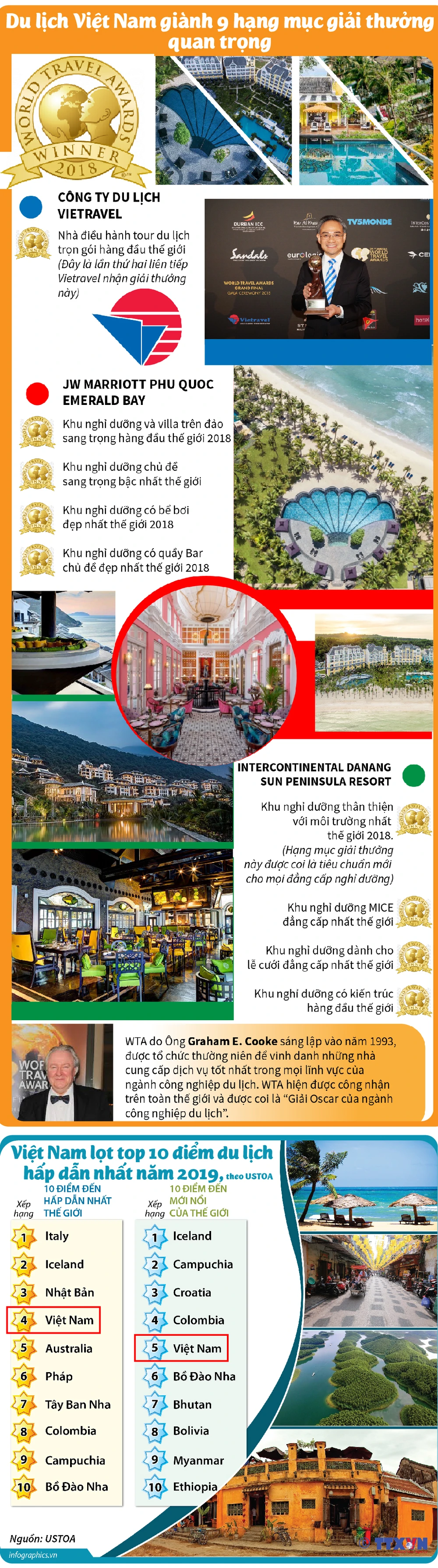 Ngày 1-12-2018, Việt Nam vinh dự được xướng danh tại 9 hạng mục giải thưởng quan trọng tại Lễ trao giải thưởng Du lịch Thế giới 2018 (được xem là “Oscar của ngành du lịch”) tại Lisbon (Bồ Đào Nha). Mới đây, Hiệp hội Du lịch Mỹ (USTOA) cũng đánh giá Việt Nam là 1 trong 10 điểm đến hấp dẫn nhất thế giới trong năm 2019.
