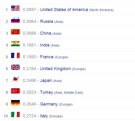 Các quốc gia Mỹ, Nga và Trung Quốc lần lượt tiếp tục giữ vững ba vị trí dẫn đầu. Xếp ở vị trí thứ tư là Ấn Độ. Kế đến lần lượt là Pháp, Anh, Nhật Bản, Thổ Nhĩ Kỳ, Đức và Italy. Hàn Quốc đã ra khỏi top 10, đứng thứ 11. Năm ngoái, sức mạnh quân sự Hàn Quốc xếp thứ bảy.