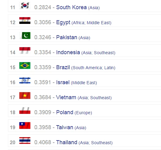 Trong khi đó, Việt Nam đứng thứ 17/126, trên cả Thái Lan, Malyasia, Úc.