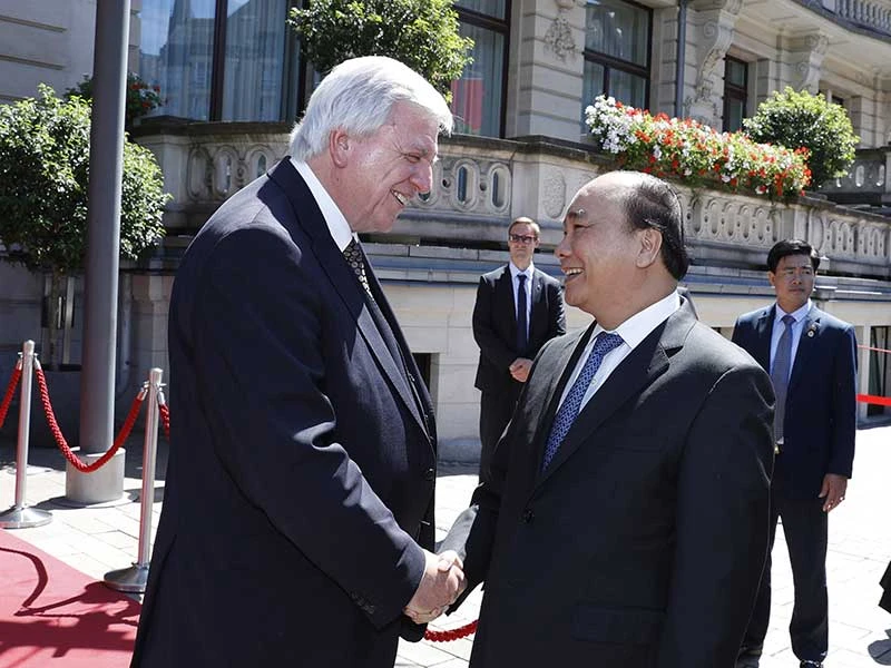 Thủ tướng Nguyễn Xuân Phúc gặp ông Volker Bouffler, Thủ hiến bang Hessen (Cộng hòa Liên bang Đức). Ảnh: TTXVN
