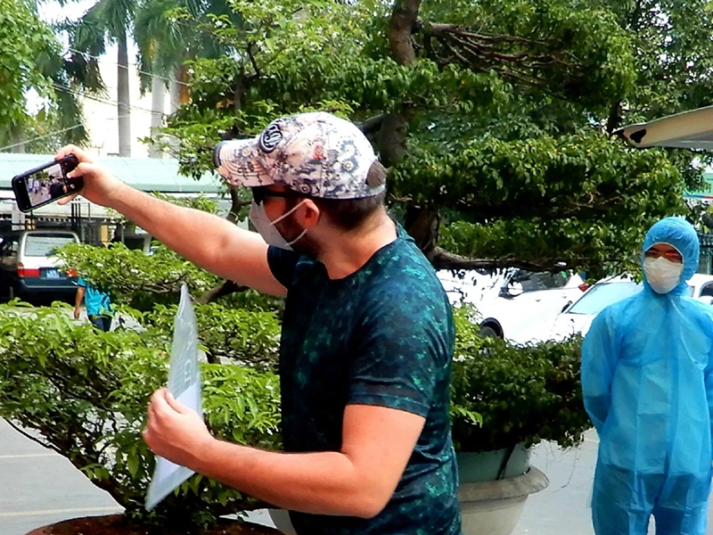 Bệnh nhân người Mỹ vui vẻ “seo-phi” với mọi người trước khi lên xe về nhà. Ảnh: T.AN