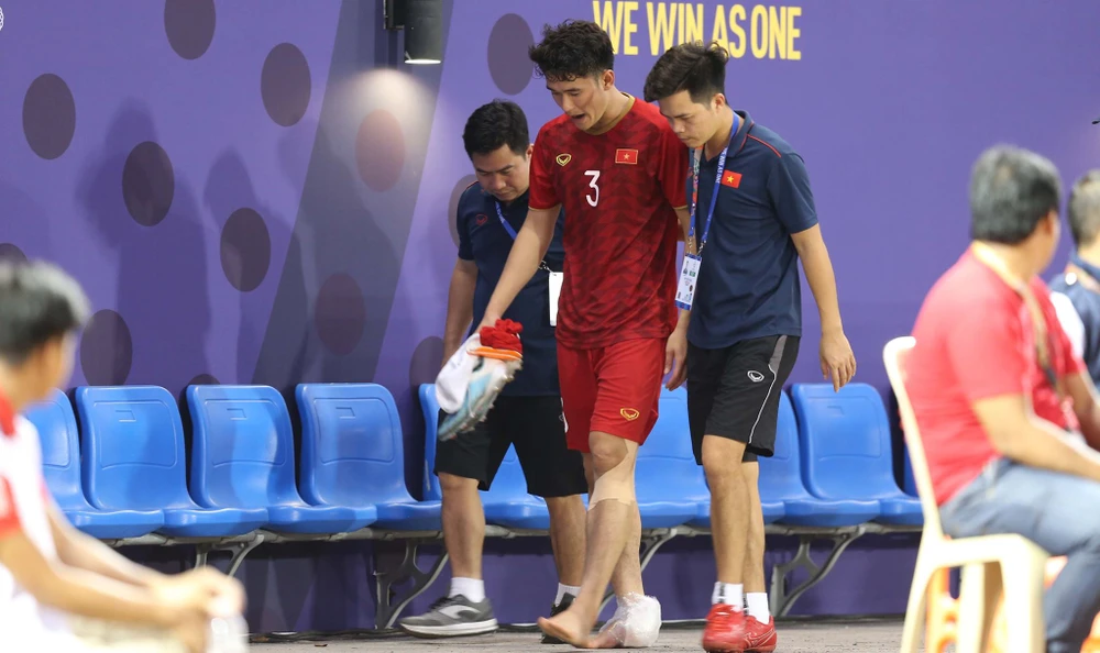 Huỳnh Tấn Sinh khập khiễng rời sân trận gặp Brunei. Ảnh: ANH PHƯƠNG