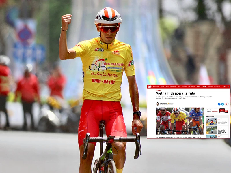 Javier Sarda Perez, tay đua đoạt áo vàng Cúp Truyền hình 2019 và bài báo của tạp chí AS Tây Ban Nha. Ảnh: PHẠM HUY