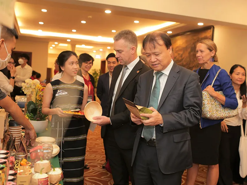 Thứ trưởng Đỗ Thắng Hải cùng các đại biểu tham quan gian hàng trưng bày sản phẩm xuất khẩu đi Mỹ tại diễn đàn. Ảnh: TÚ UYÊN