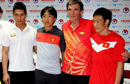Hai HLV và đội trưởng hai đội Việt Nam - Myanmar tại buổi họp báo trước trận đấu. Ảnh: XUÂN HUY