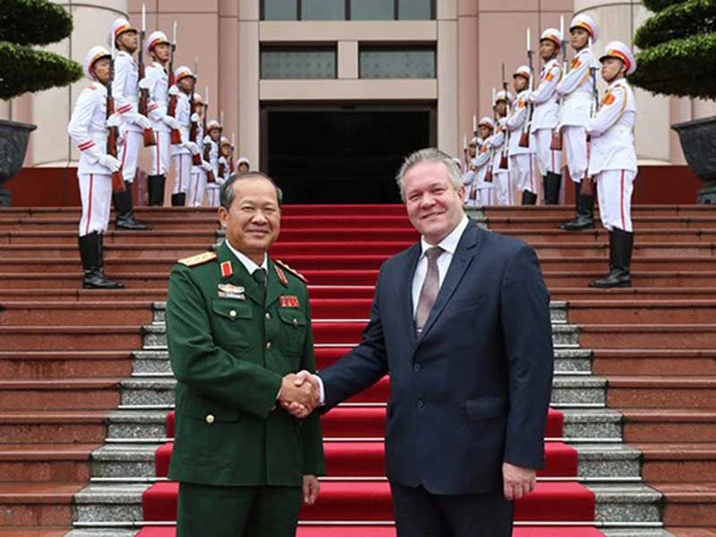 Thượng tướng Bế Xuân Trường đón ông Vladimir Nikolaevich Drozhzhov, Phó Giám đốc Cơ quan Liên bang về hợp tác kỹ thuật quân sự Nga, Chủ tịch Phân ban Nga. Ảnh: mod.gov.vn