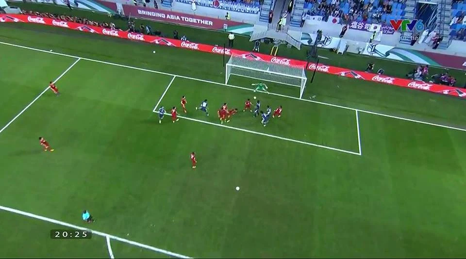 Phút 19, từ quả đá phạt bên cánh phải, bóng được treo vào cho một cầu thủ Nhật Bản đánh đầu trong tư thế khó đi ra ngoài.
