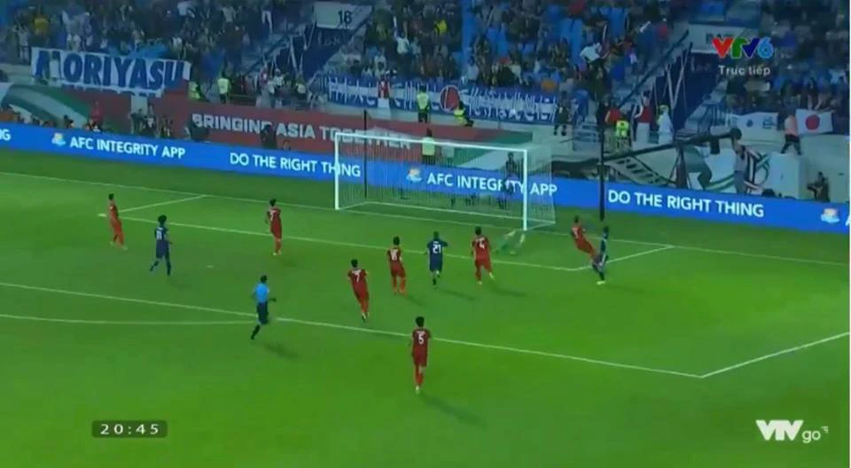 Phút 24, từ quả đá phạt góc của Nhật Bản, đội trưởng Maya Yoshida bật cao đánh đầu cận thành tung lưới Văn Lâm. Tuy nhiên, trọng tài sẽ xem lại VAR trong tình huống này.