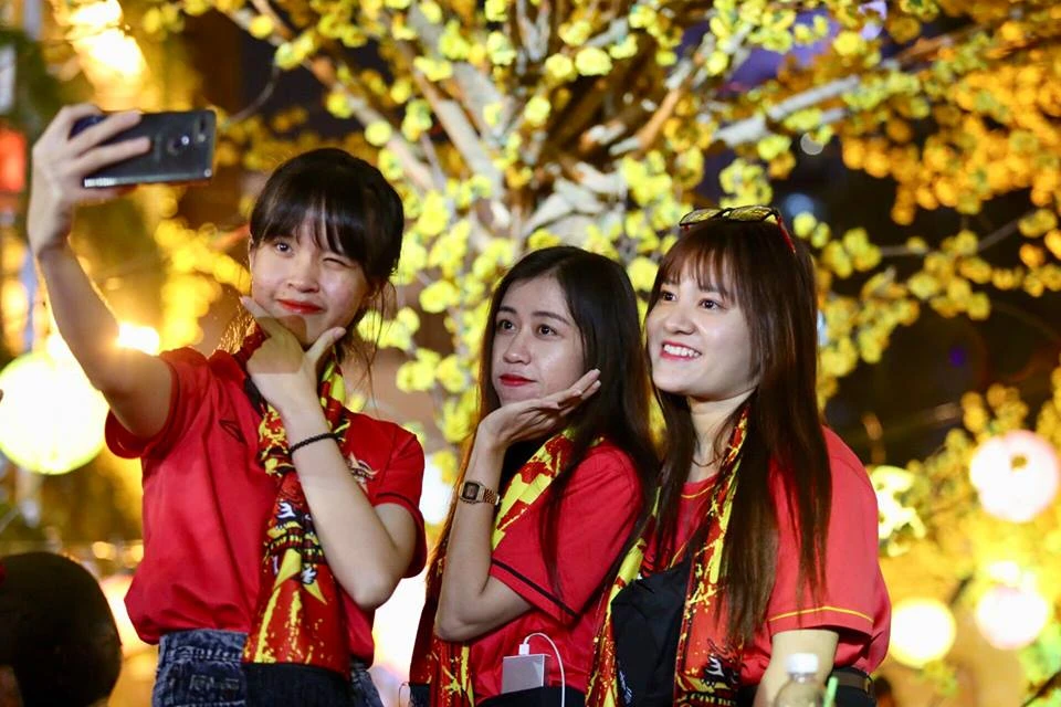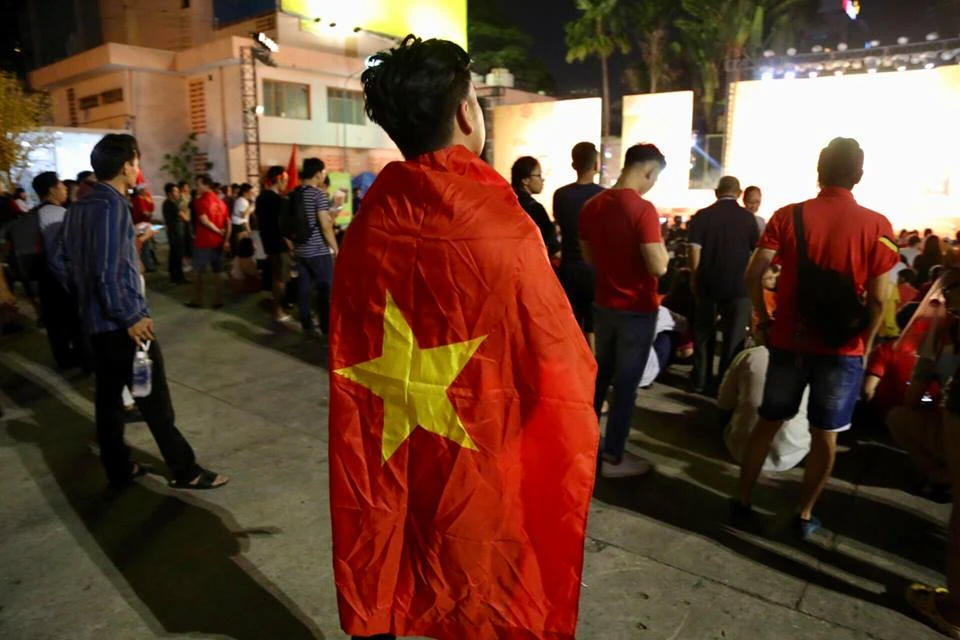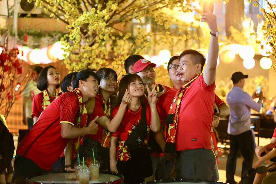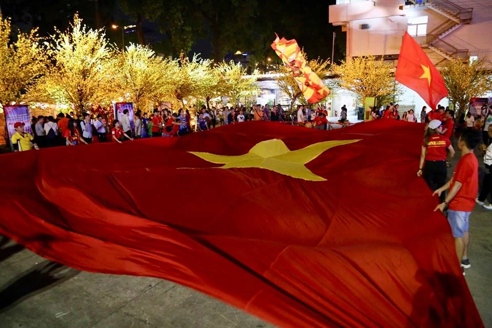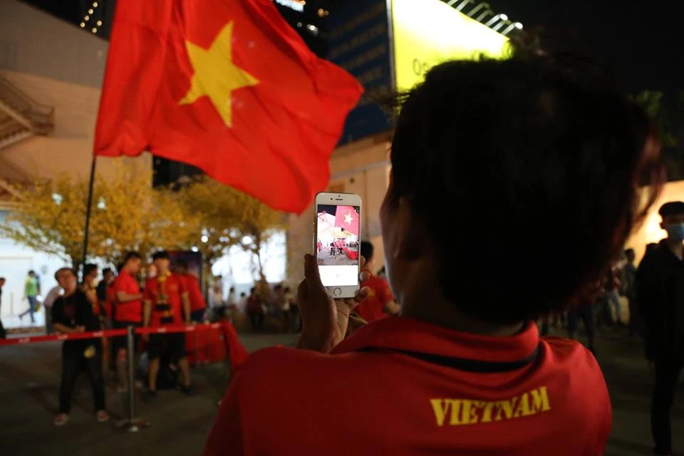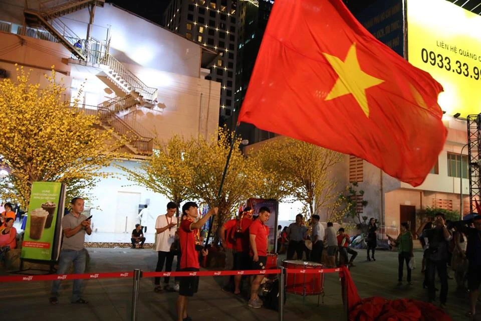 Các CĐV Việt Nam rợp sắc đỏ đến Nhà Văn hóa Thanh Niên cổ vũ cho đội tuyển Việt Nam. ẢNH: HOÀNG GIANG.