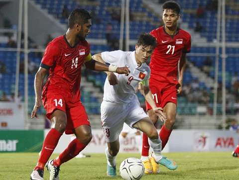 Xuân Trường thỉnh thoảng vẫn có những đường chuyền với điểm rơi hiểm, nhưng phía Singapore đã cảnh giác rất cao trong việc ngăn các tiền đạo Việt Nam lòn xuống để đón bóng.