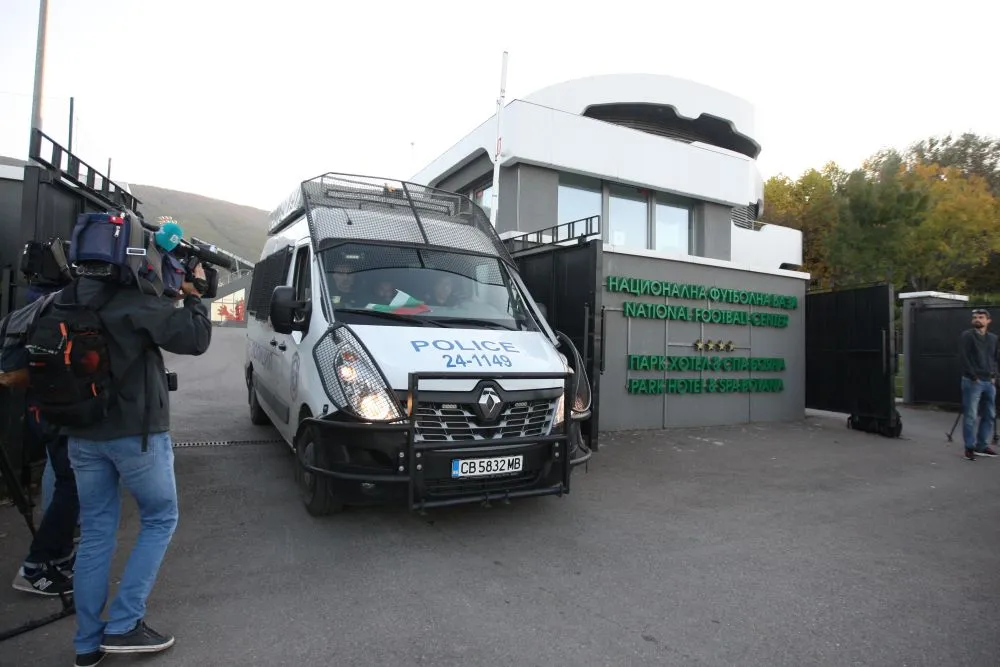 Xe cảnh sát xuất hiện tại trụ sở Liên đoàn Bóng đá Bulgaria. ẢNH: REUTERS